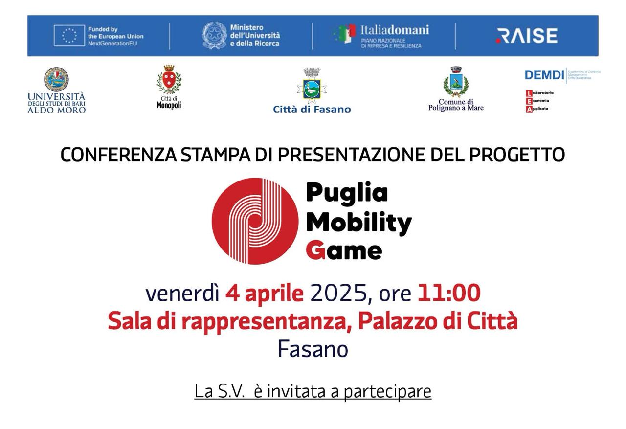 Sarà presentato venerdì 4 aprile alle ore 11:00, nella Sala di rappresentanza del Palazzo di Città del Comune di Fasano, il progetto "Puglia Mobility Game", innovativo esperimento gestito e curato dal Laboratorio di Economia Applicata del Dipartimento di Economia, Management e Diritto dell’Impresa dell’Università degli Studi di Bari Aldo Moro, con il supporto tecnologico del sistema Pin Bike, già attivo in oltre 30 città europee.
