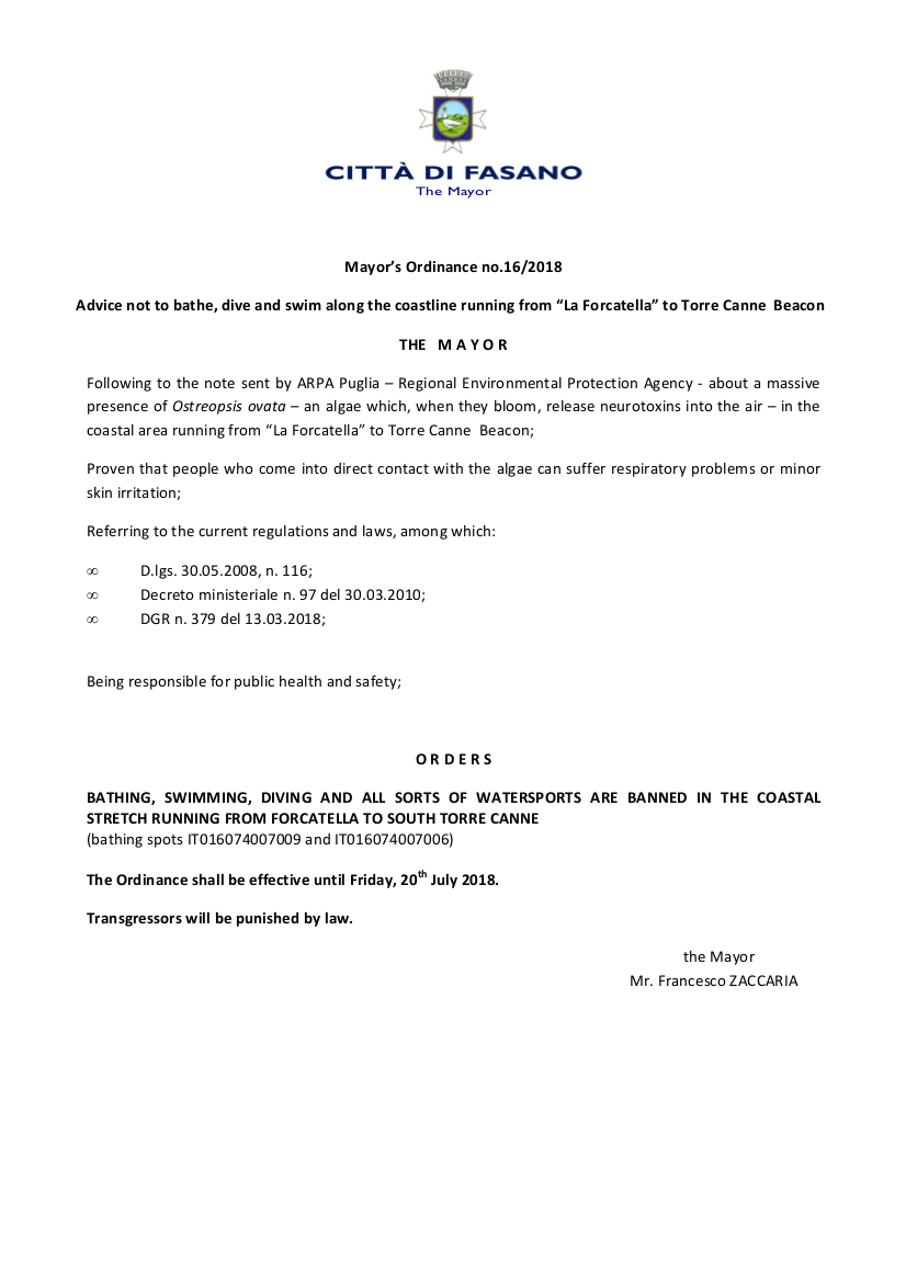 Mayor’s Ordinance no.16/2018 - Advice not to bathe, dive and swim along the coastline running from “La Forcatella” to Torre Canne Beacon