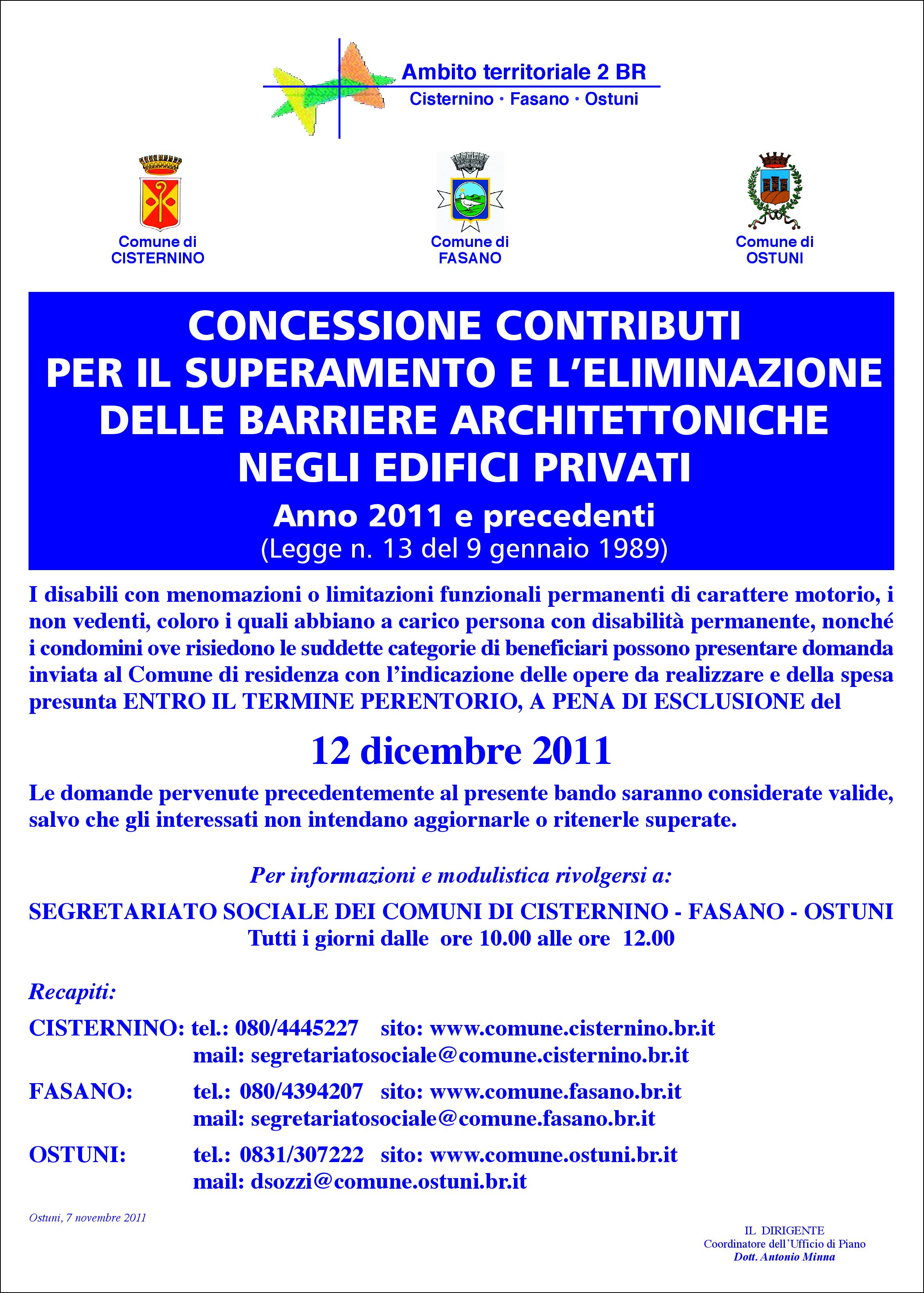 I disabili con menomazioni o limitazioni funzionali permanenti di carattere motorio, i non vedenti, coloro i quali abbiano a carico persona con disabilità permanente, nonchè i condomini ove risiedono le suddette categorie di beneficiari, possono presentare domanda inviata al Comune di residenza con l'indicazione delle opere da realizzare e della spesa presunta entro il termine perentorio, a pena di esclusione del 12 dicembre 2011.