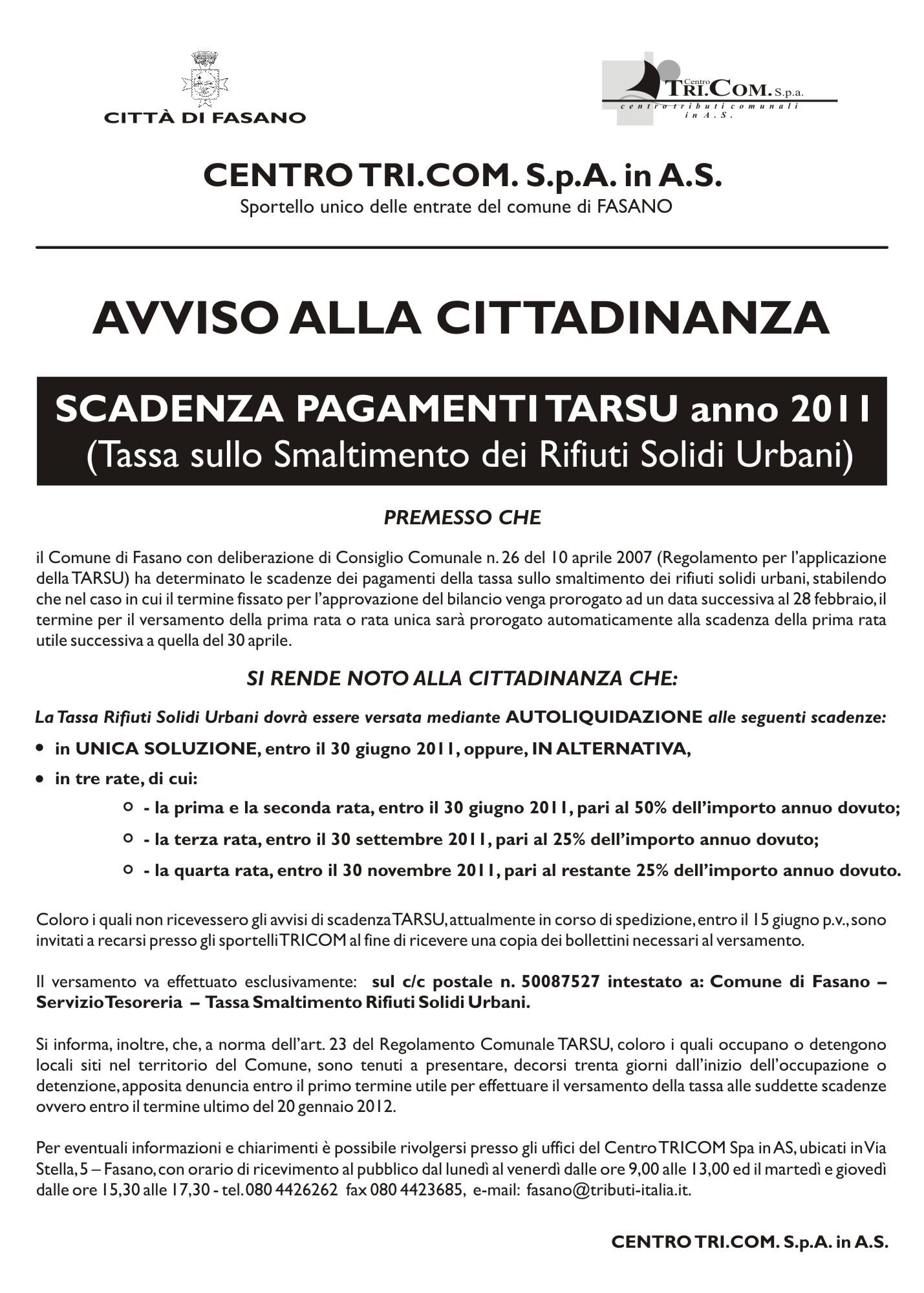 come si pagaIl comune riscuote la tassa con l'iscrizione a ruolo del tributo dovuto, con l'emissione di avvisi di pagamento, detti anche avvisi bonari che permettno al cittadino di pagare, in un'unica soluzione entro il 30 aprile 2011, oppure , in alternativa, in quattro rate: 30 aprile, 30 giugno, 30 settembre e 30 novembre. qualora il bilancio di previsione per l'esercizio di riferimento venga adottato oltre il28 bfebbraio, il Regolamento del Comune di Fasano, prevede la riscossione della TARSU in alternativa alla soluzione unica entro il 30 giugno, in tre rate: 30 giugno (50%), 30 settembre (25%) e 30 novembre (25%).